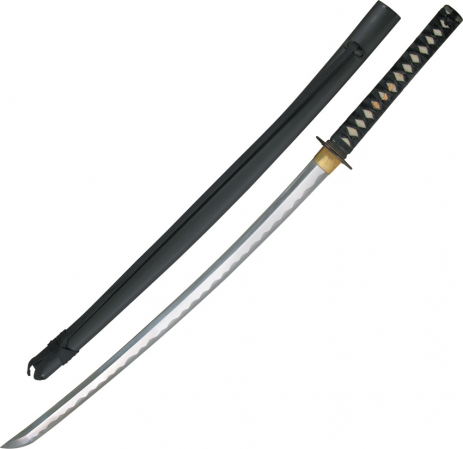 Musashi Series. 41" overall. 28.5" carbon steel blade. Black leather wrapped handle. Double ring iron tsuba. Maintenance kit included. Black wood scabbard.