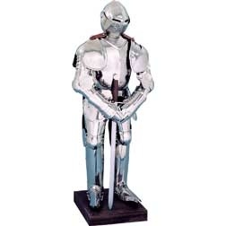 Paul Chen Knight in Shining Armor. 26" overall including base. Polished stainless steel suit of plate armor fully articulated, complete with miniature sword. Black acrylic base.