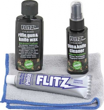 Flitz Gun/Knife Care Kit. Includes 1.7 oz. spray bottle Stainless Steel & Chrome Clean, 1.76 oz. tube Metal, Plastic and Fiberglass polishing paste, 1.76 oz. spray bottle Rifle/Gun & Knife Wax and Thick & Thirsty Microfiber cloth. Use on bluing, stocks, stainless, nickel and more. Helpful to keep your gun, rifle, knife, axe or sword looking new. Hang packaged.