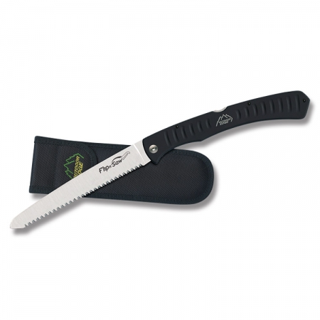Outdoor Edge Flip n' Saw Folding Saw. 8" closed lockback. 7" saw tooth blade. Blade steel is Manganese 65 with chrome coating. Black finish aluminum handles with non-slip rubberized coating. Black nylon belt sheath. Hang packaged.