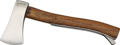 Marbles No 6 Safety Axe. 11 1/2" overall. Carbon steel axe head with 2 3/4" cutting edge. Hardwood handle with safety guard. Axe head will have small rust spots and need sharpening. Some boxes may be damaged. Made in China.