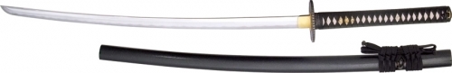 Paul Chen Katana Sword. Practical Plus Katana Sword. 41" overall. Sharpened 27 1/4" hand forged and differentially tempered carbon steel blade. Genuine rayskin handle with black leather wrap. Black finish iron tsuba. Wooden scabbard with a black lacquer finish.