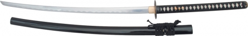 Paul Chen Practical Pro Katana 45 3/4" overall. 29 1/2" sharpened hand forged high carbon steel blade. Black synthetic leather wrapped handle with antiqued finish iron tsuba and pommel. Black lacquer finish wood scabbard. Cloth storage sleeve.