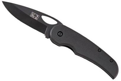 Ka-Bar K-2 Tegu Folder. 4" closed linerlock. Black finish 3Cr13 stainless hollow ground standard edge blade with thumb slot. Black is etched K-2, Textured black aluminum handles. Black finish stainless pocket clip.