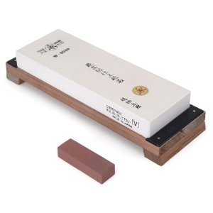 Japanese Deluxe Water Stone. 8000 grit. Measures 8" x 2 7/8". Comes mounted on wood base. Boxed. Made in Japan.