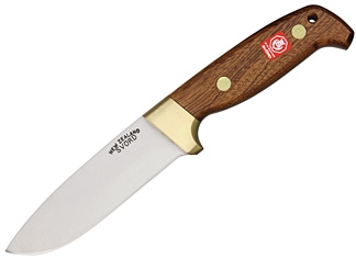 9 3/4" overall. 4 7/8" blade. Full tang. Varnished sapele mahogany handles. Brass rivets and guard. White cord lanyard. Black leather belt sheath.