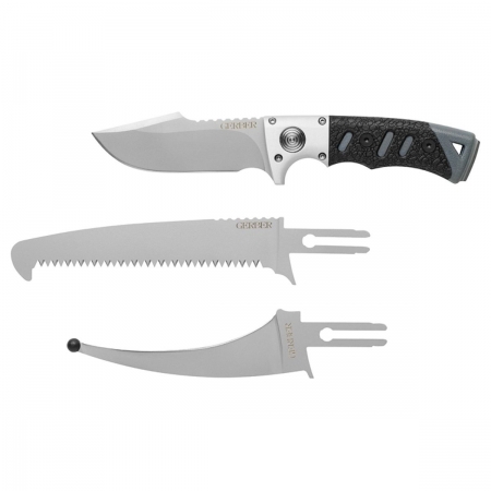 The Metolius Exchange-A-Blade features the Gerber patented easy blade swapping mechanism. It includes 3 of our most popular blades: E-Z Open, Utility Saw, and Fine Edge Drop Point.