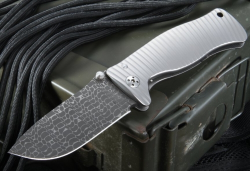 COMMENTS: A single piece of titanium was used to construct the frame of the knife! The knife handle is 3d machined and anodized. The SR-1 feels fantastic in hand and extremely solid. Drop point blade design made from Chad Nichols stainless lizard pattern damascus. The integral bar lock has a reinforced hardened steel replaceable section - it really gives a strong lock. This steel section is replaceable after many years of use, bringing the lock back into it's original locking position. The SR-1 lock also features a rotating safety lock and over-extension preventer. The knife comes attractively packaged in a wooden display box. The SR-1 comes with a removable titanium clip and utility tool. Pocket clip can be mounted on the left or right as well as removed. Filed thumb rest on the blade spine for a secure grip. Dual thumb studs for easy right or left hand operation. Lanyard hole in the handle. Ultra smooth opening and closing.