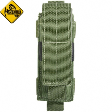 Maxpedition Single Sheath. Measures 4" high x 1 1/2" wide. Elastic sides can expand to 2" wide. Can hold an extra flashlight, small cellular phone, multitool, folding knife, or handgun magazine. It can also be attached to your backpack as an accessory or be carried on the belt upright or sideways. Will fit belt up to 2" wide. The length of sheath lid is adjustable with internal Velcro attachments for longer items or is completely removable for those who want the quickest access. Color: Green.