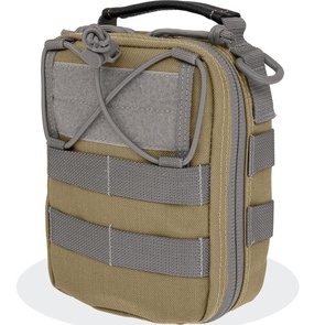 Maxpedition FR-1 Pouch. Measures approximately 7" x 5" x 3" with full zipper opening. Can be used as a medical pouch. Front and back halves have layered pockets topped with a wide array of elastic loops. The full zipper "clamshell" can be fine tuned to various angles using a paracord adjuster. Features Torch-Lair in front with bungee cord compression. Color: Khaki/Foliage