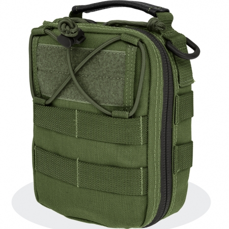Maxpedition FR-1 Medical Pouch. Main: 7" x 5" x 3" with full zipper opening. Carry handle: Yes. Modular webbing (front): 2 rows, 2 x 2.5" wide channels. Modular webbing (sides): 2 rows, 1 channel. The FR-1 Pouch design evolved from a first aid kit bag with added versatility. It can be used as a general purpose organizational pouch or even a specialized medical pouch. Both front and back halves have layered pockets topped with a wide array of elastic loops, essential for keeping contents in place. The full zipper clamshell opening can be fine tuned to various angles using a paracord adjuster. Lastly, the FR-1 has a Torch-Lair in front with bungee cord compression. Color: OD green.