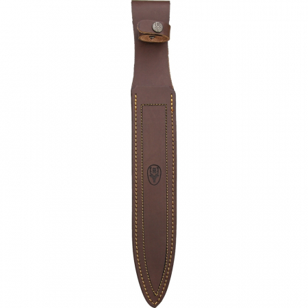 15 1/2" overall. 10" 440A stainless blade. Crown stag handle. Brass guard. Brown leather belt sheath.