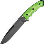 Hogue Zombie Fixed Blade. 12" overall. 7" A2 tool steel drop point blade with KG 2400 series GUN-KOTE coating. Heat treated to RC 57-59. Blade is etched Zombie-X. Pearlized polymer Zombie green handles with dual lanyard holes. Storage area and allen wrench in handles. Black Mil-spec ballistic nylon belt sheath with protective insert and leg tie. MOLLE compatible. Multiple belt mounting options.