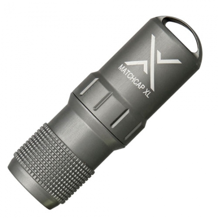 Exotac MATCHCAP XL Survival Match Case with Strikers. 3.60" overall length. 1.20" diameter. Textured aluminum construction with lanyard hole. Match capacity: 40 kitchen matches, 32 NATO matches or 25 stormproof matches. Fits matches up to 2.9" in length. Note: For maximum match capacity, place a majority of the matches head up with a few head down. Two built-in strikers work well with both safety and strike anywhere matches. O-ring sealed. Waterproof to more than 5 meters. Same design as the MATCHCAP original except XL version features: larger, improved striking surfaces; and larger diameter and height for increased capacity. The new design leaves up to 0.3" to spare for tinder storage when using stormproof matches and nearly half of the MATCHCAP XL is available for storage if using kitchen matches. The extra space may also be used to store water purification tablets, medicine, fishing hooks, first aid supplies, etc. Packaged with extra O-rings, extra match strikers, and instruction manual. Empty weight: 1.25 oz. Gunmetal body.
