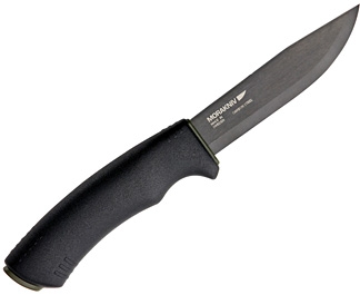 Mora Bushcraft. 9" overall. 4 1/4" black finish heavy design Swedish carbon steel blade. Textured black sure-grip rubber handle with green core. Black molded sheath with two interchangeable belt clips. Hang packaged.