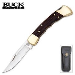 Buck Folding Hunter Fingergroove. 4 7/8" closed lockback. 420HC stainless clip blade. Finger grooved Macassar ebony Dymondwood handles with brass bolsters. Black leather belt sheath.