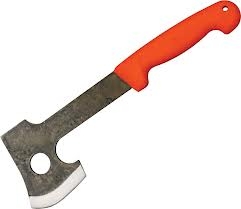 Svord Kiwi Axe Hatchet. 12 1/2" overall. 6 1/4" Swedish high carbon tool steel axe head with 3" cutting edge. Orange polypropylene handle. Lanyard hole. Yellow polyurethane belt sheath. Bulk packed.