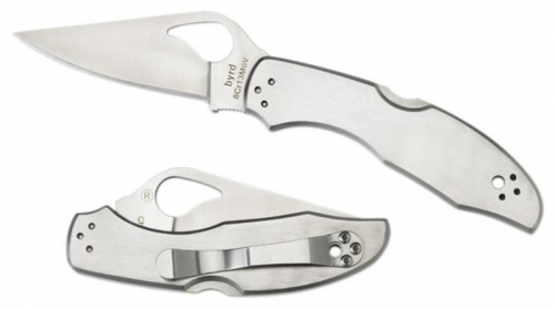 Byrd Meadowlark 2. 3 7/8" closed lockback. 2 7/8" 8Cr13MoV stainless blade with thumb slot. Stainless handles with four-way reversible stainless pocket clip.
