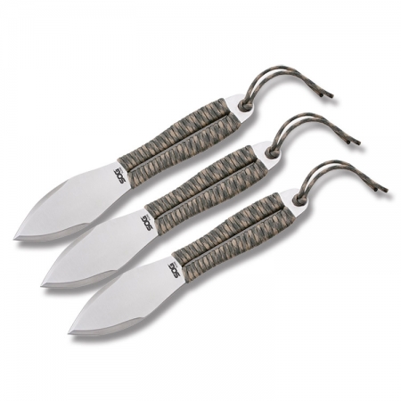 Sog Fling 3 Piece Throwing Knife Set. Knives are 9 1/2" overall with 4 5/8" 9Cr18MoV stainless double edge blade. Full tang. Balanced for enhanced throwing accuracy. Camouflage (OD green and tan) paracord wrapped handle and lanyard. Black nylon belt sheath holds all three knives. Boxed with hanging tab.