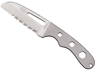 Myerchin Safety Dive Knife. Generation 2. 8 1/2" overall. 4 1/8" partially serrated sheepsfoot blade with shackle slot. One piece German Pro Marine stainless construction. Fingergrooved handle features three of the most commonly used metric wrenches. For survival, the handle can be wrapped with 1/8" parachute cord. Lanyard hole. Black nylon belt sheath. Serial numbered. Hang packaged.