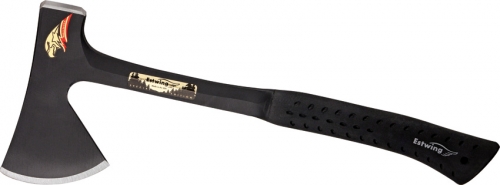Estwing Camper's Axe Special Edition. 18 3/8" overall. 7 1/8" black coated axe head with 4 1/8" beveled cutting edge. American forged in one piece out of genuine American steel. Black patented nylon vinyl shock reduction grip with lanyard hole. Embroidered black nylon axe belt sheath. Bulk packed.