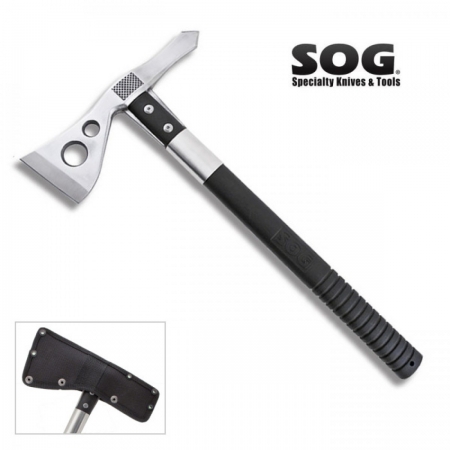 SOG Tactical Tomahawk. 15 1/4" overall. 8 1/4" 420 stainless axe head with 2 3/4" cutting edge and polished satin finish. Opposite end of axe head is a sharpened pick. Black fiberglass reinforced nylon handle. Ideal for breaching operations, excavation, obstacle removal, extraction, and other utility applications. Black nylon belt sheath. Hang packaged.