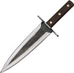 16 7/8" overall. 11 1/4" Swedish I-6 high carbon tool steel double edged dagger blade. Hardened to 58 HRC. Full tang. Brown hardwood handle with a high carbon tool steel guard. Lanyard hole. Embossed black leather belt sheath. Bulk packed.