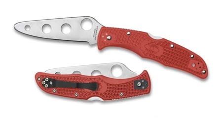 Spyderco Delica 4 Trainer. 4 1/4" closed lockback. Unsharpened GIN-1 stainless blade with thumb hole pull. Red FRN handles with lanyard hole. Reversible black coated stainless pocket clip.