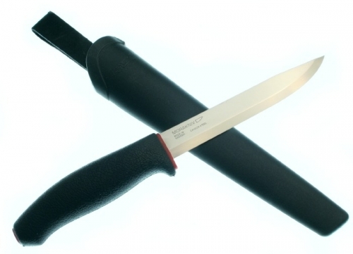Mora Craftline All-Around Knife. 10 3/4" overall. 5 3/4" carbon steel blade. Black textured rubber handle with red trim. Black plastic belt sheath with drain hole.