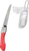 Silky POCKETBOY Folding Saw. 8" closed. 6 3/4" blade with large teeth. Replaceable rust-resistant, hard chrome-plated, taper-ground Japanese steel blade with impulse-hardened, non-set MIRAI-ME teeth and lashing hole. The blade has two open locking positions for in line or flush cutting. Red aluminum handles with Gom non-slip rubberized overlay offers a sure grip, even for the most challenging projects. Features a spring loaded thumb lever lock. Lanyard hole. Embossed clear composition flip top storage case with metal belt loop. Hang packaged. Ideal for pruning, arborist, outdoor hunting, woodworking, lawn and garden, bamboo cutting and more!