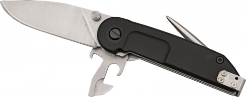 Linerlock - 4" closed. 2 3/4" N690Co stainless cobalt steel matte finish blade with thumb stud. Also includes flat screwdriver, bottle opener, can opener and marlin spike. Black aluminum handles with bail. Stainless pocket clip.
