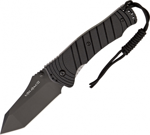 Joe Pardue Utilitac II. - 4 5/8" closed linerlock.Black EDP coated AUS-8A stainless standard edge tanto blade with dual thumb studs. Black grooved Zytel� handles. Reversible black finish stainless pocket clip. Black cord lanyard. Made in Taiwan.