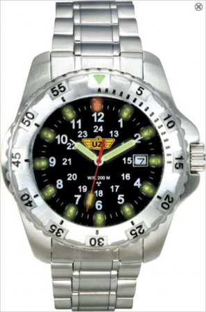 Uzi Defender Watch. Self-Illuminating Watch. Black face. Stainless casing, back, bezel and wrist band. Tritium hands and markers glow for over 25 years. Precision Swiss quartz component movement. Screw down crown. Rotating bezel. Hardened mineral crystal. Second hand. Date. Water resistant to 200 meters. Gift boxed.