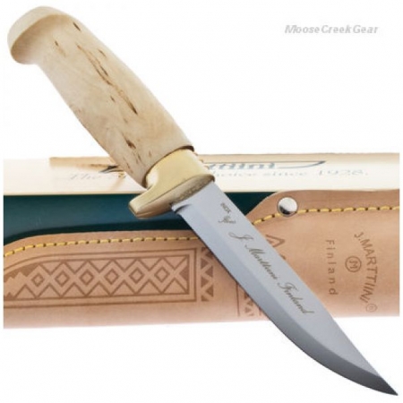 Golden Lynx - 8 3/4" overall. 4 1/8" stainless blade. Curly birch handle with ABS metallic coated finger guard. Tan leather belt sheath.