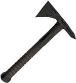 Voodoo Hawk Mini Black - 12 1/2" overall. 7" black finish 3Cr13 stainless head with 3" cutting edge and pick. Grooved black fiberglass reinforced nylon handles. Black finish metal pommel. Black nylon belt sheath. Hang packaged.