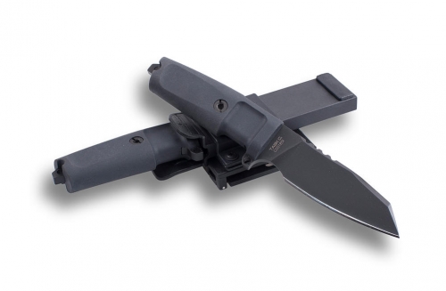 Task C Fixed Blade Black - 8 3/8" overall. 3 1/2" black finish Bohler N690 stainless modified tanto blade. Integral finger guard with lashing hole. Blade is flat ground on both sides. Black Forprene handle. Heavy duty tip with enlarged lanyard hole. Deluxe molded black polymer belt sheath.