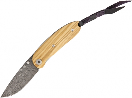Mini Damascus Olive Wood - 3 1/8" closed linerlock. 2 3/8" Damascus steel drop point blade with dual thumb studs. Olive wood handles. Leather lanyard. Wooden presentation box.