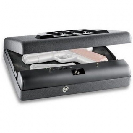 Dimensions: 12.25" x 10.68" x 3.53". Weight: 8.5lb. Interior dimensions: 11.9" x 8.28" x 3.11". Illuminated No-Eyes keypad. Door opens instantly upon correct code entry. Auto slide-out drawer. Foam-padded interior holds firearm in place and protects finish. All steel case. Tamper detect feature reports when unauthorized access attempts have been made. Includes back up keys. Security cable allows for lock down and tethering to a fixed object. Fabric strap storage in lid. Boxed.