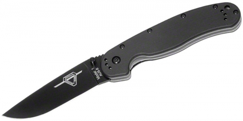 RAT-1 - 5" closed linerlock. Black finish AUS-8 stainless blade with thumb stud. Black nylon handles with reversible stianless pocket clip. Lanyard hole.