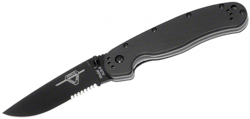 RAT-1 - 5" closed linerlock. Black finish, partially serrated AUS-8 stainless blade with thumb stud. Black nylon handles with reversible stainless pocket clip. Lanyard hole.