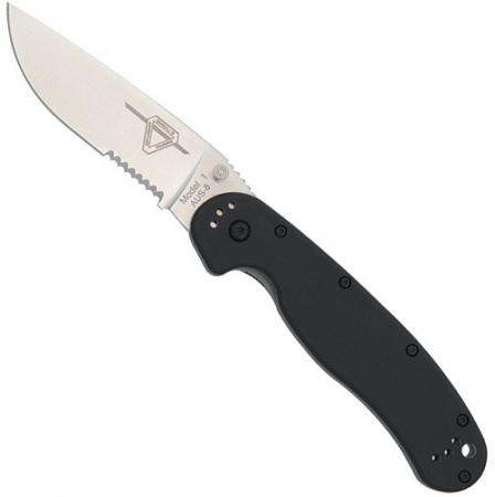 RAT-1 - 5" closed linerlock. Partially serrated, satin finish AUS-8 stainless blade with thumb stud. Black nylon handles with reversible stainless pocket clip. Lanyard hole.