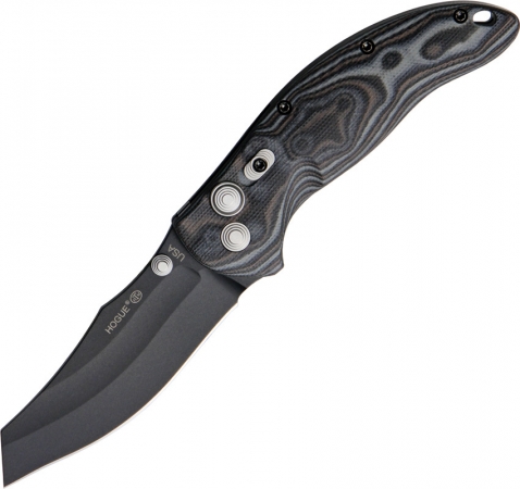 EX-04 Button Lock - Extreme Series. 4 5/8" closed. 3 1/2" black finish 154CM stainless wharncliff blade with dual thumb studs. Manual safety lock doubly secures knife in open position. Black and gray G-Mascus G-10 handle scales. Lanyard hole. Black finish stainless pocket clip. Elishewitz design.