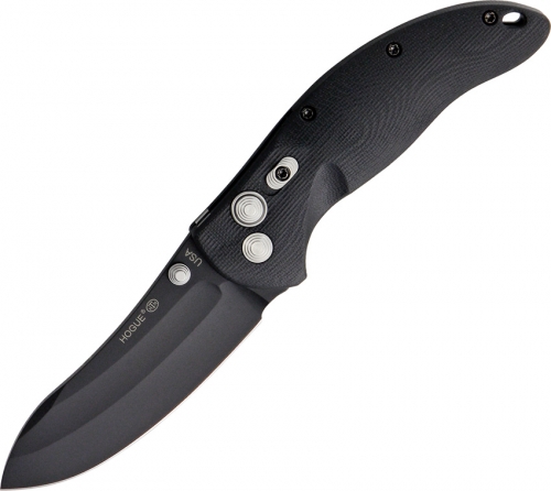 EX-04 Button Lock - Extreme Series. 4 5/8" closed. 3 1/2" black finish 154CM stainless upswept blade with dual thumb studs. Manual safety lock doubly secures knife in open position. Black G-10 handle scales. Lanyard hole. Black finish stainless pocket clip. Elishewitz design.