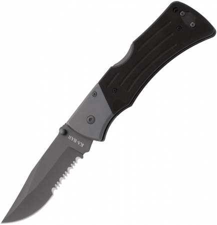 Mule Lockback - Heavy duty design. 5 1/4" closed. 3 7/8" gray finish 420 stainless partially serrated clip blade with dual thumb studs. Black G-10 handles. Gun metal gray finish stainless bolster. Lanyard hole. Reversible gun metal gray finish stainless pocket clip.