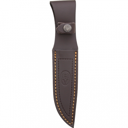 8 3/4" overall. 4 5/8" 440 stainless blade. Brown wood handle with finger guard and pommel. Brown leather belt sheath.