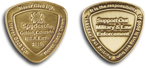 1 1/8" x 1 1/8". Gold finish. Support Our Military & Law Enforcement on front with Spyderco logo on back. Bulk packed.