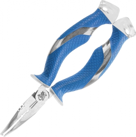 7" overall. 3" titanium bonded steel jaws. Features wire cutter and ring splitter. Full tang. Clear rubberized handles with blue Cuda scale pattern non-slip grips. Lanyard slots. Perfect for cutting line, wire and open/close hook eyes. Hang packaged.