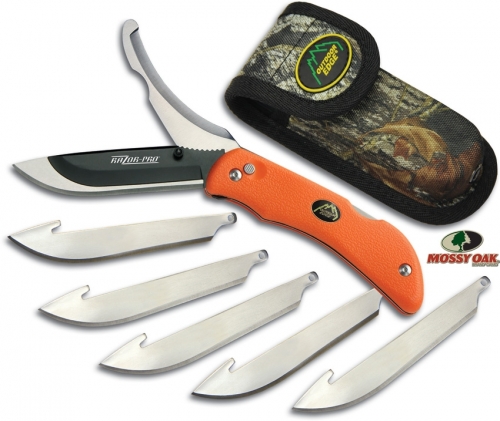 4 1/2" closed lockback. 3 1/2" stainless blade with black oxide coated blade holder and dual thumb studs. Blade may be sharpened or push the lock button to remove dull blade and insert a new one. Orange rubberized TPR handles with inlay shield. Comes with six surgical steel replacement blades. Mossy Oak nylon belt sheath.