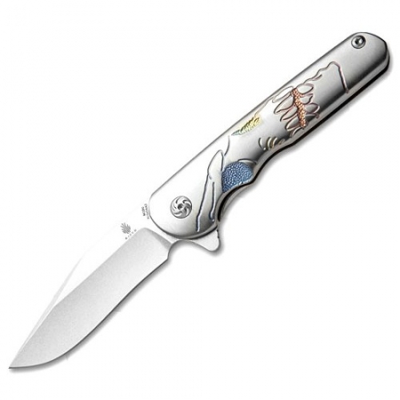 3" stonewashed M390 tool steel clip blade with flipper, 4 1/4" closed, titanium handle, frame lock, pocket clip. China.