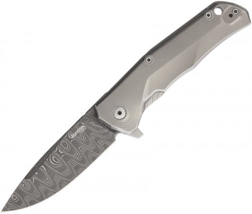 4" closed. 3" Damascus steel drop point blade. Matte finish titanium handle. Extended tang. Lanyard hole. Pocket clip. The user may choose three ways to equip the knife: a basic version without a flipper and pin on the blade, a thumb stud version with the pin on the blade, or adding the flipper for quick opening action. Includes Torx T6 and T8 tools on keyring. Boxed.